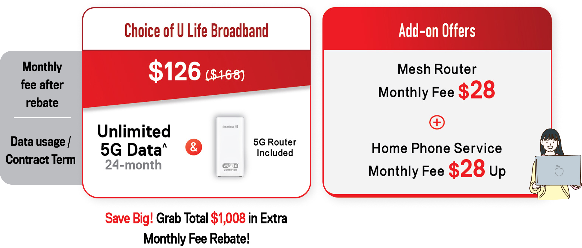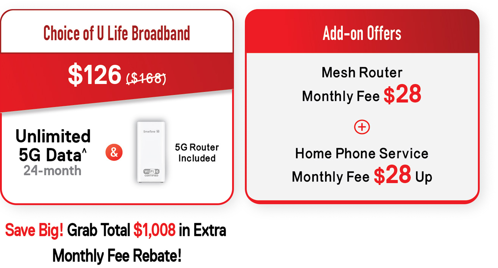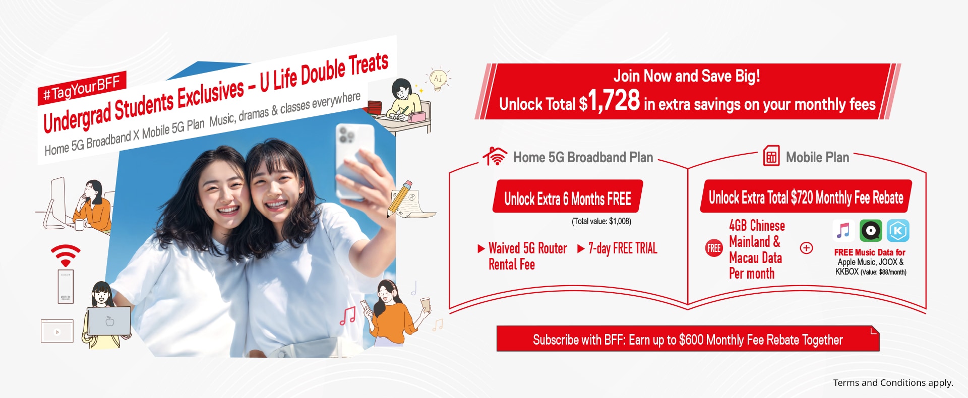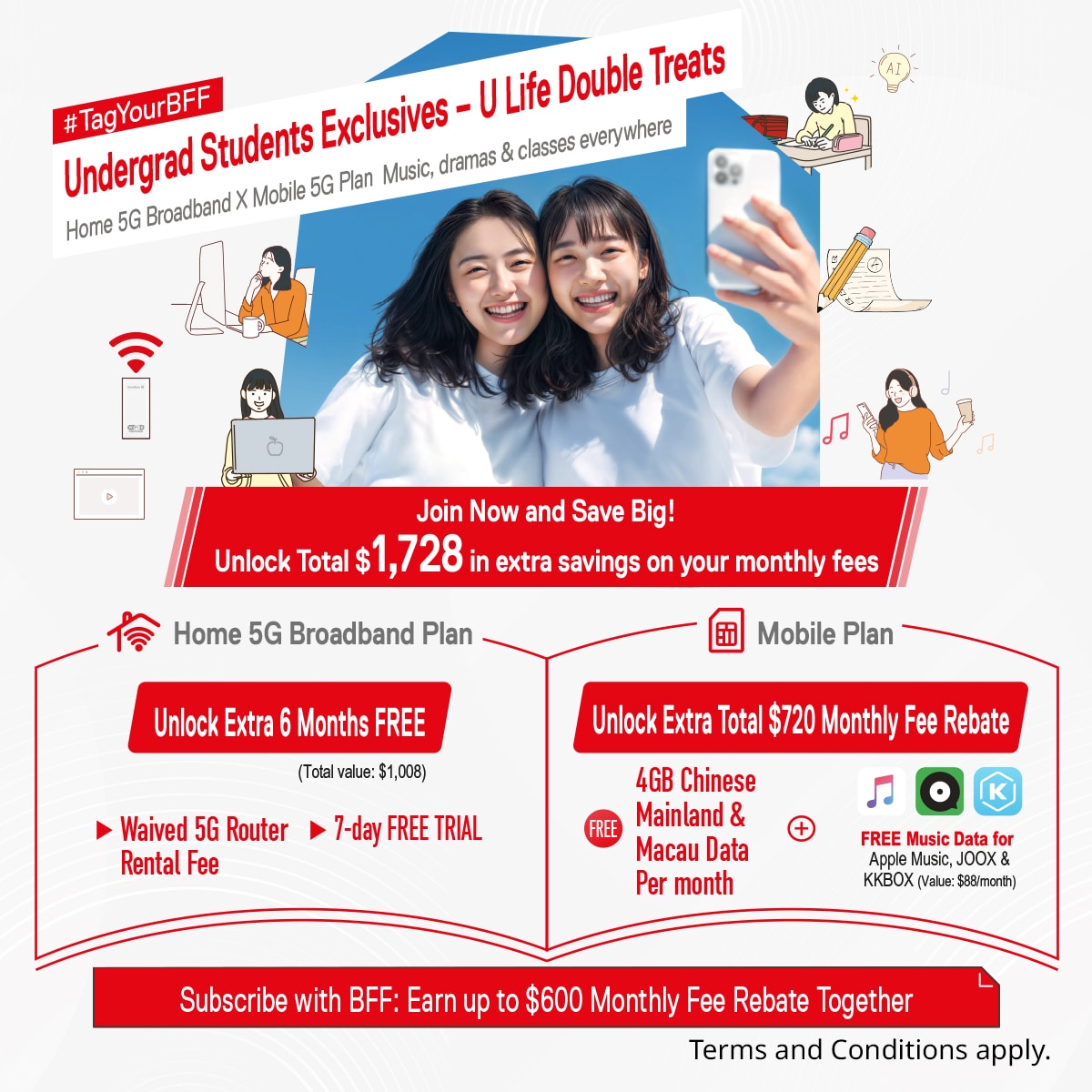 Offer valid for limited period only. Offer is appliable for customers who subscribe the designated SmarTone Home 5G Broadband service plan at a designated residential address for 24-month fix term contract subscription. Applicant must be aged 18 or above and a full-time student of designated post-secondary education institutions in Hong Kong. Designated post-secondary education institutions in Hong Kong include accredited universities in Hong Kong, Caritas Institute of Higher Education, Caritas Bianchi College of Careers, Centennial College, Chu Hai College of High Education, Gratia Christian College, Hang Seng University of Hong Kong, HKCT Institute of Higher Education, Hong Kong College of Technology, HKU SPACE, Hong Kong Nang Yan College of Higher Education, Tung Wah College, Vocational Training Council or Hong Kong Academy for Performing Arts. Also applicable to applicant aged 18 to 25 with valid overseas post-secondary education institutions student ID card. Valid student ID card and identity document must be presented upon registration for the Student Plan. Monthly fee HK$126 is calculated based on the original monthly fee HK$238 for Home 5G Broadband plan, after monthly fee rebate HK$70 monthly and Extra 6-Month Monthly Fee Rebate (HK$168 x 6-month, total value is HK$1,008) within contract period have been given to the customer, total value of. Offers will be forfeited without any compensation if the Customer terminates the contract during the committed contract period.