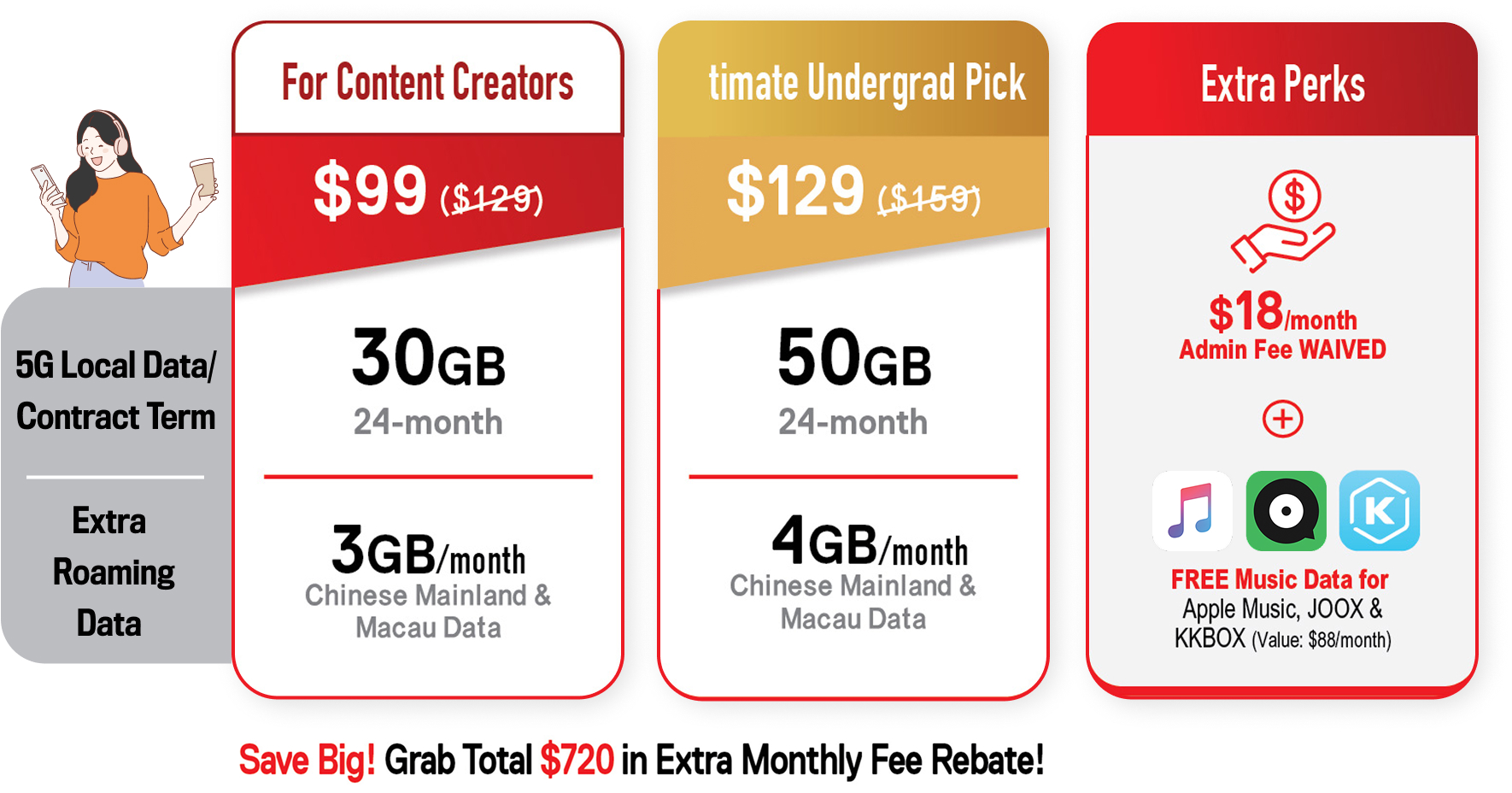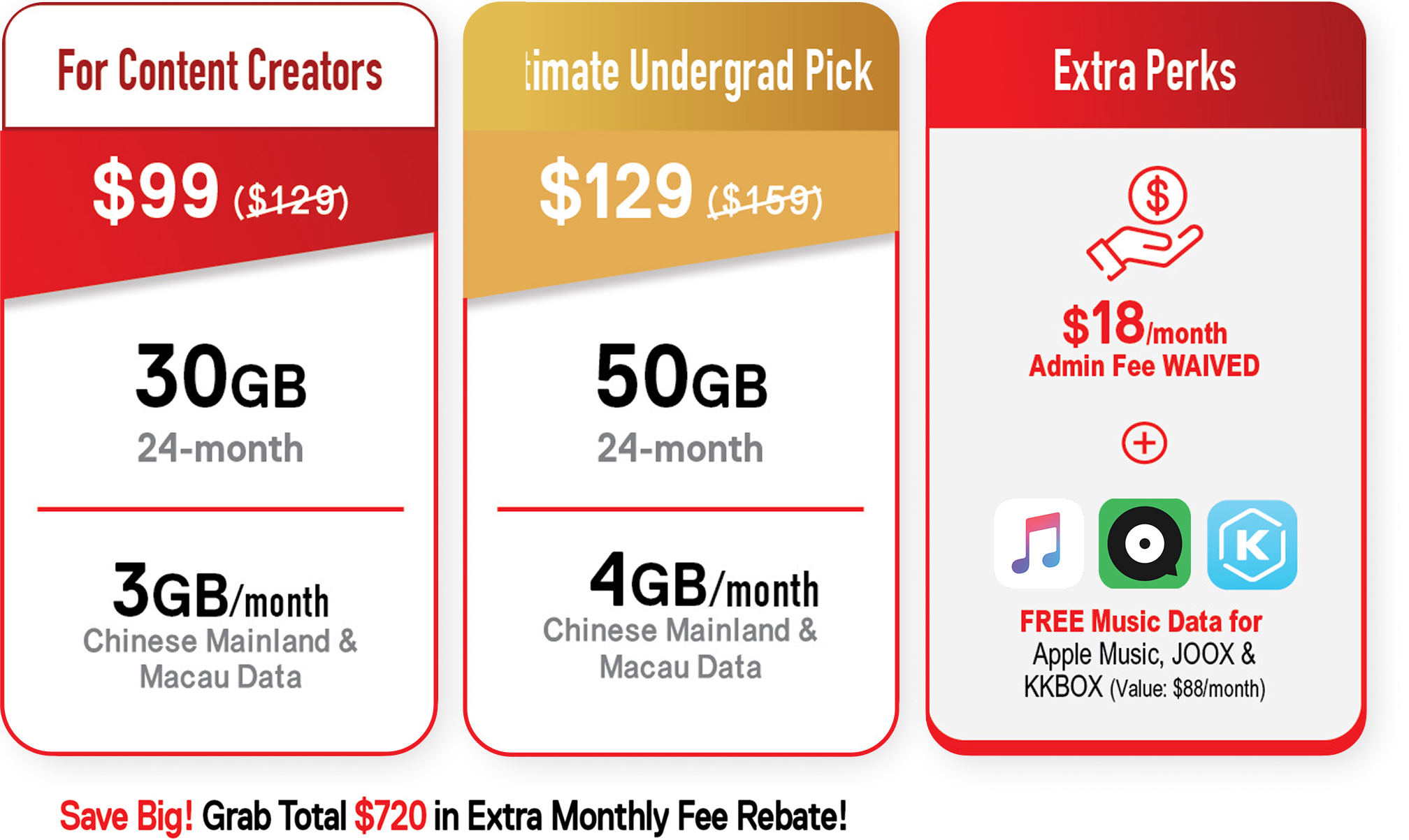 Monthly fee HK$109/ HK$129/ HK$159 is based on the original monthly fee HK$138/ HK$168/ HK$208 for 5G Student Plan, after a rebate of HK$29/ HK$39/ HK$49 per month credited to the customer during the contract period. After expiry of the contract, the customer will be charged at the prevailing comparable plan if the customer continues to use the service.