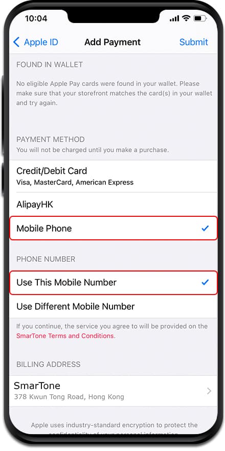 - Tap “Mobile Phone and “Use This Mobile Number” (SmarTone mobile number), tap "Submit".