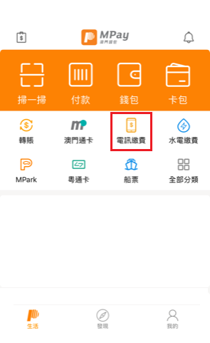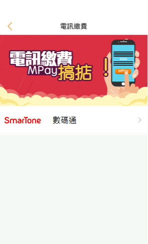(1) 打 開 MPay 應 用 程 式 , 點 選 “ 電 訊 繳 費 ” |